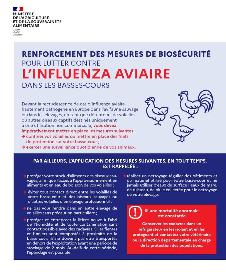 Les mesures de prévention et de biosécurité obligatoires depuis le 22 octobre 2025 sur l'ensemble du territoire sont :